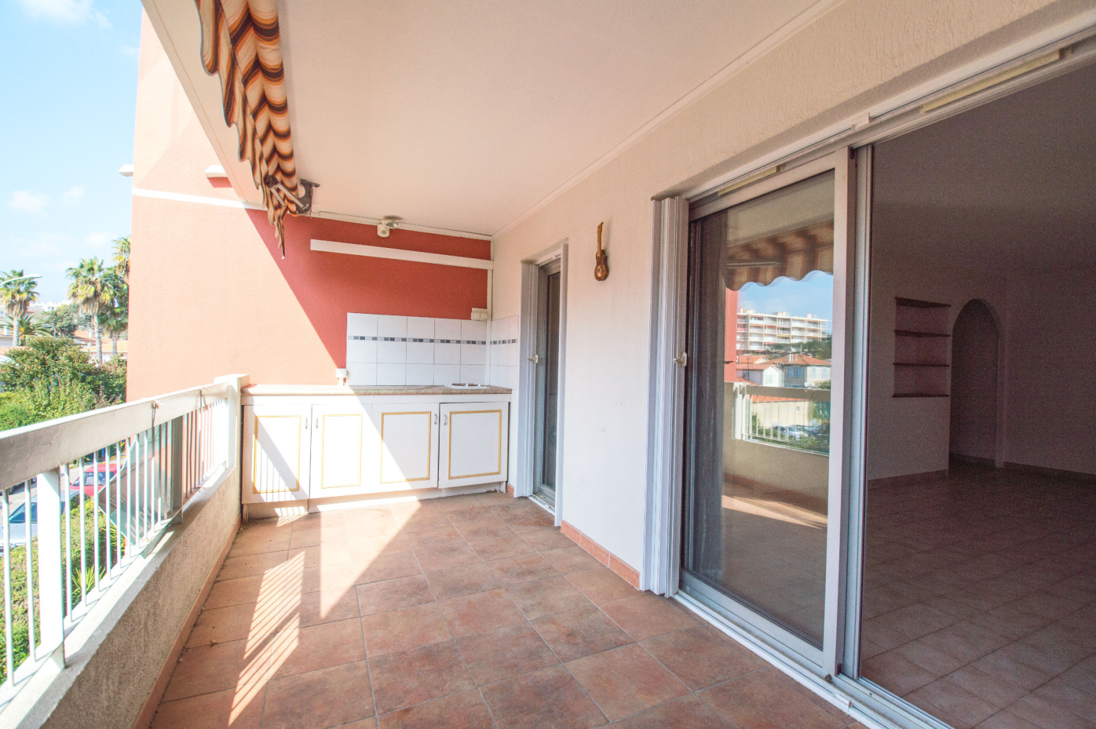 cet appartement est composé d'un hall d'entrée avec placard, d'un séjour et d'une cuisine donnant sur une terrasse profonde, de deux chambres, d'un balcon, d'une salle de bains baignoire + douche, d'un wc indépendant, d'un garage avec une cave attenante.