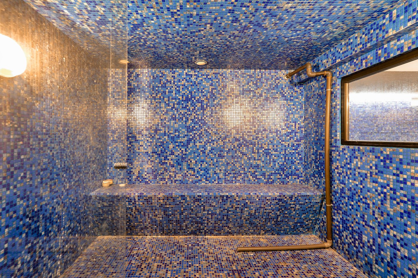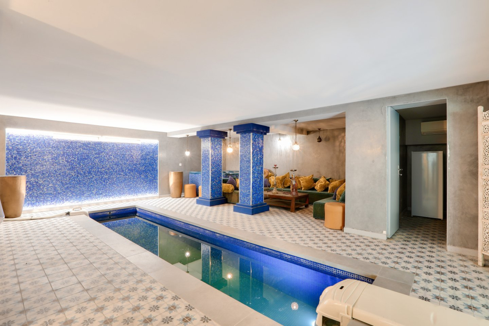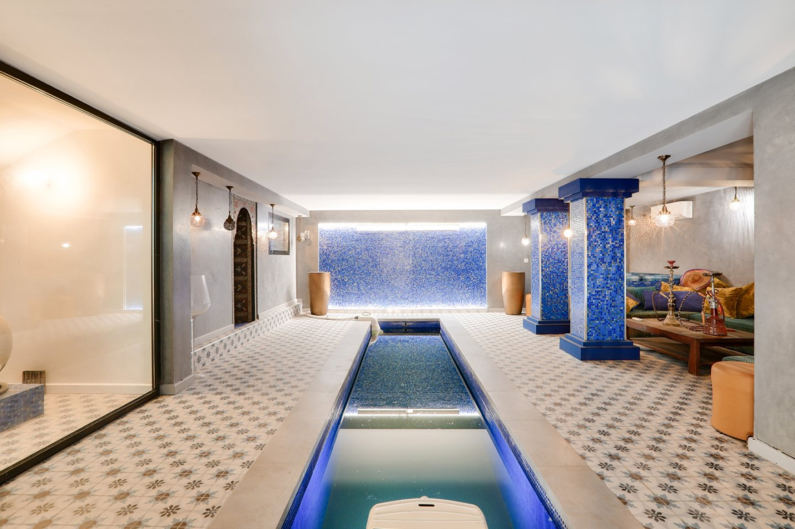 Au niveau inférieur, un véritable espace bien-être avec couloir de nage intérieur, hammam et jacuzzi, ainsi qu’un garage.