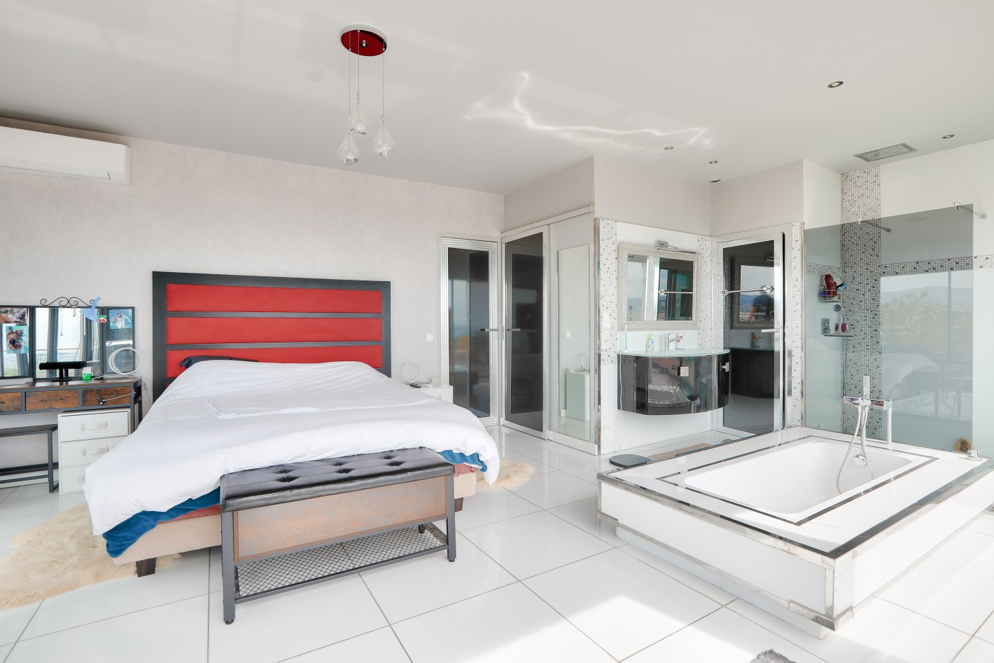 À l’étage, quatre chambres dont une suite parentale avec salle de bains (douche et baignoire), ouvrant sur une magnifique terrasse de 76 m² avec vue panoramique sur la mer et le Cap d’Antibes.