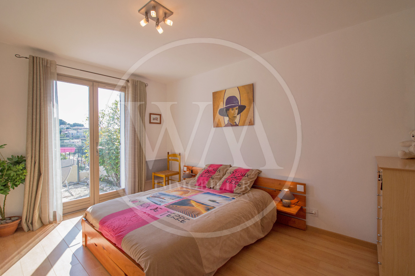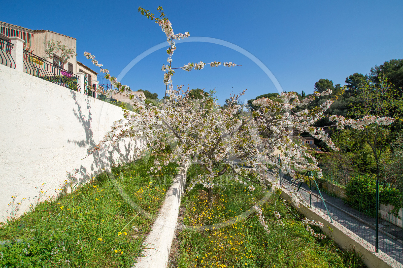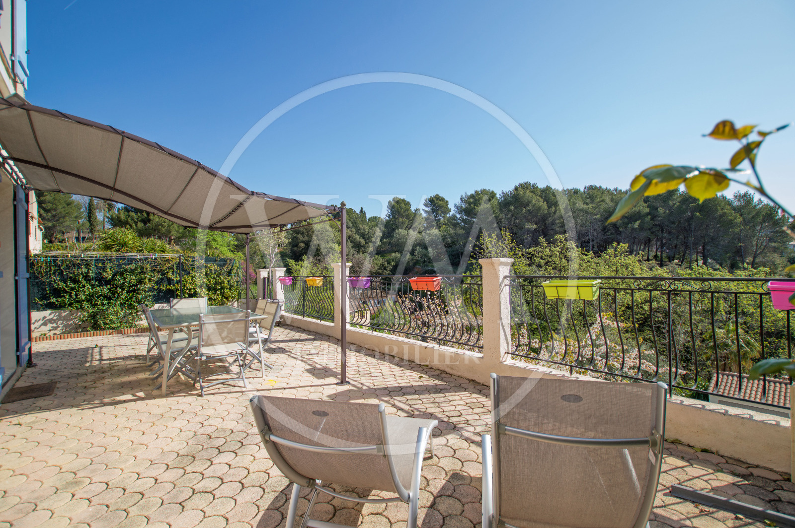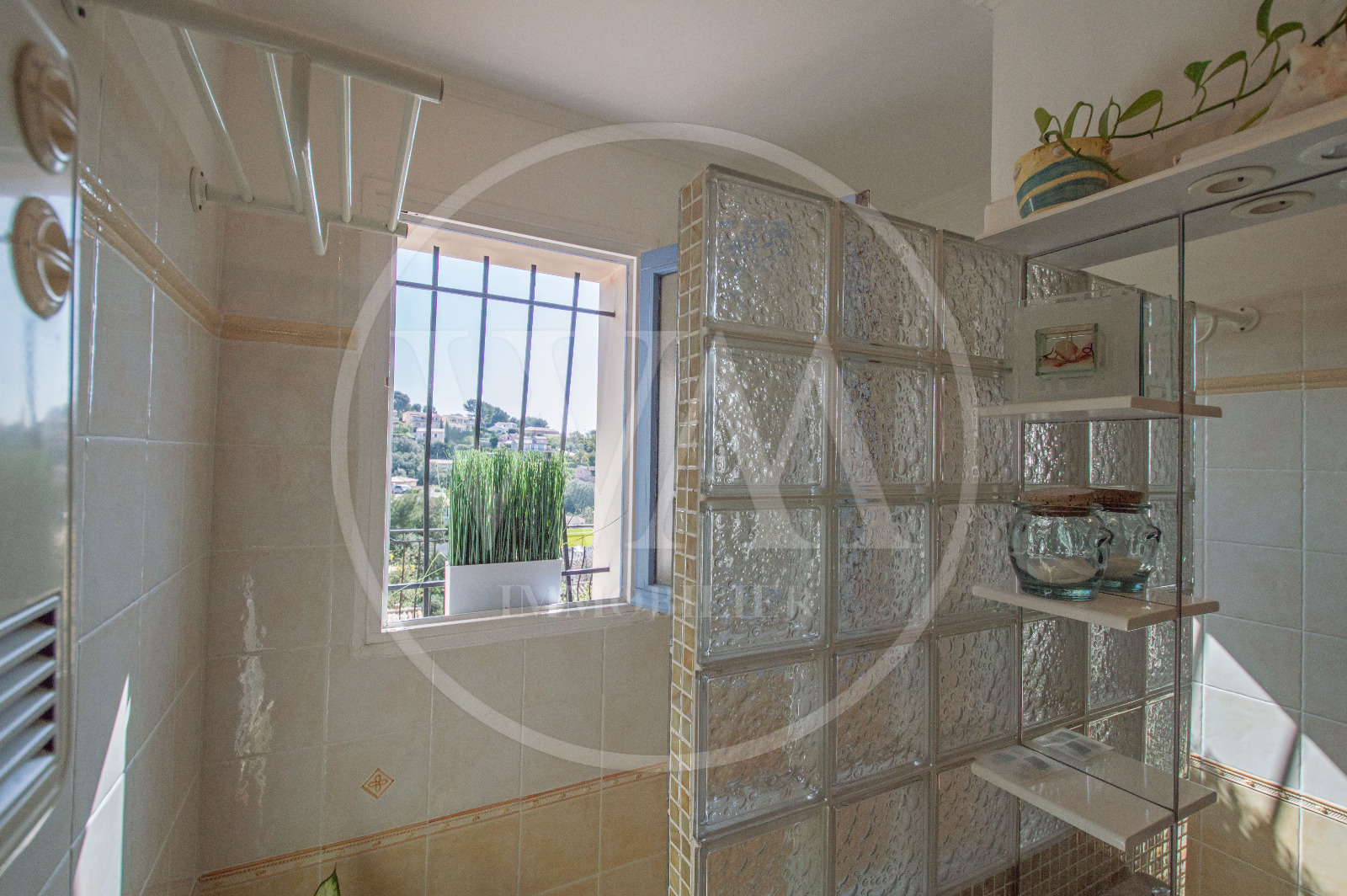 Dans un Domaine de Standing et fort d'histoire où nous n'avons nul besoin de rappeler que Marcel Pagnol avait choisi de s'établir pendant près de trente ans pour ses qualités et la beauté des paysages, un véritable havre de paix situé dans les collines entre la Gaude et Cagnes sur Mer. Le Domaine de l'étoile comprend une école maternelle et élémentaire, un hôtel 4*, un centre sportif et des espaces boisés. Jolie villa de trois à quatre pièces de 90 m², jumelée d'un côté, sur un niveau, en très bon état d'entretien avec grandes terrasses et jardins, vue dégagée sur les collines du domaine et les montagnes. Composée d'un séjour de 30 m², d'une cuisine indépendante, d'un dégagement, d'une chambre et d'une salle de douche avec wc, d'une terrasse avec jardin et d'emplacements de stationnement pour deux véhicules. Au rez de chaussée un appartement de deux pièces avec son entrée indépendante, possibilité location saisonnière, composé d'un séjour avec cuisine US, d'une salle de douche avec wc, d'une chambre avec placard donnant sur une grande terrasse et un jardin en restanques complanté de cerisiers également au rez de chaussée une buanderie et un bureau. Les deux niveaux sont communiquant par un escalier intérieur et peuvent ainsi être réaménagés en 4 pièces.